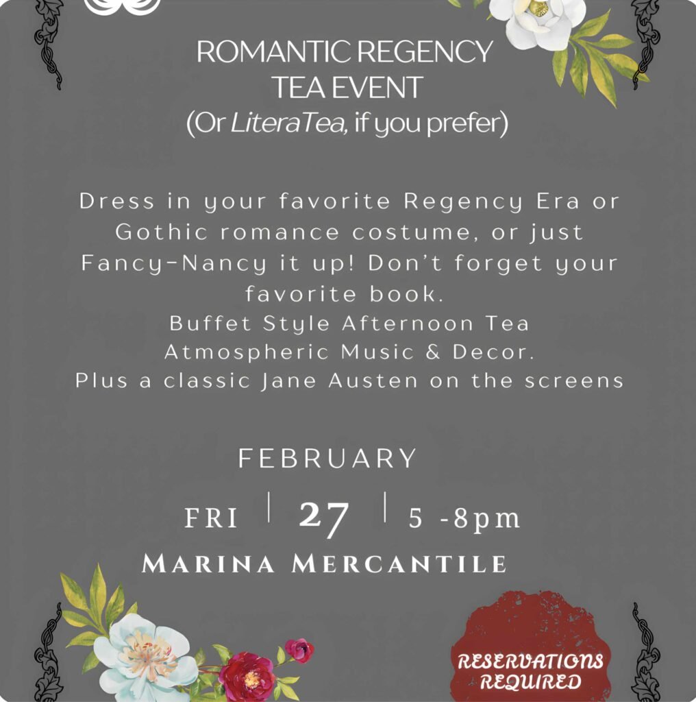 And for those who want an evening Tea Event – complete with a chance to dress up – there’s a special “Romantic Regency Tea Event” on Friday, Feb, 27 from 5-8 p.m. That one will feature buffet-style Afternoon Tea Treats, themed music and décor, and classic Jane Austen adaptations playing on the screens. Costumes most definitely encouraged!