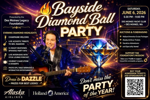 The Fourth Annual Bayside Diamond Ball, a spectacular fundraising event produced by the Des Moines Legacy Foundation, will be held Saturday, June 6, 2026, 5:30-9 p.m. at the Des Moines Yacht Club.