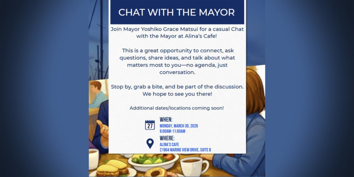 The event, titled “Chat with the Mayor,” is scheduled for 9 a.m. to 11 a.m. at Alina’s Cafe, located at 21904 Marine View Drive, Suite B (map below).