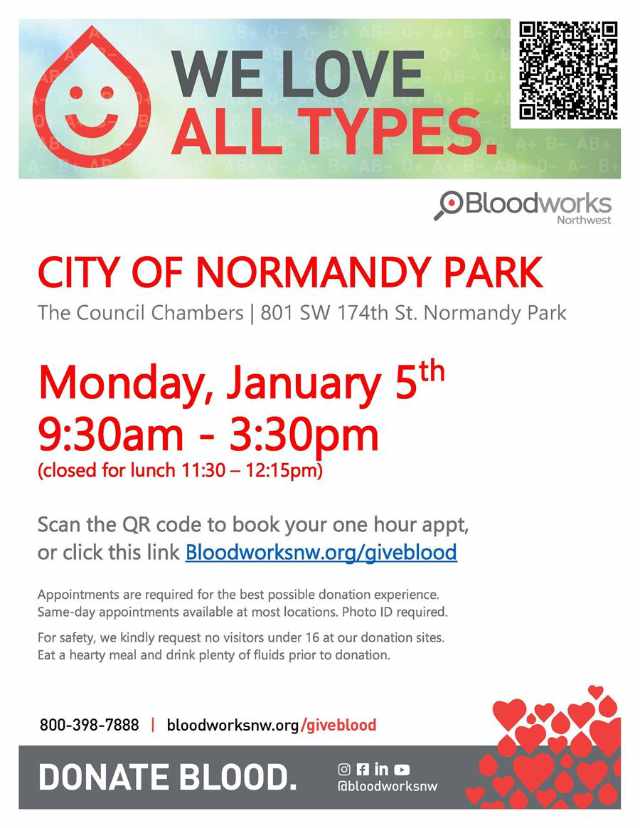 Bloodworks Northwest will host a blood drive Monday, Jan. 5, 2026 at the Normandy Park City Council Chambers, offering South King County residents an opportunity to donate blood after the holidays.