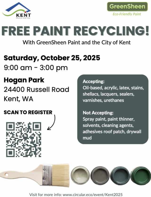 GreenSheen Eco-Friendly Paint, in partnership with the City of Kent, will host a free paint recycling event on Saturday, Oct. 25, from 9 a.m. to 3 p.m. at Hogan Park (map below).