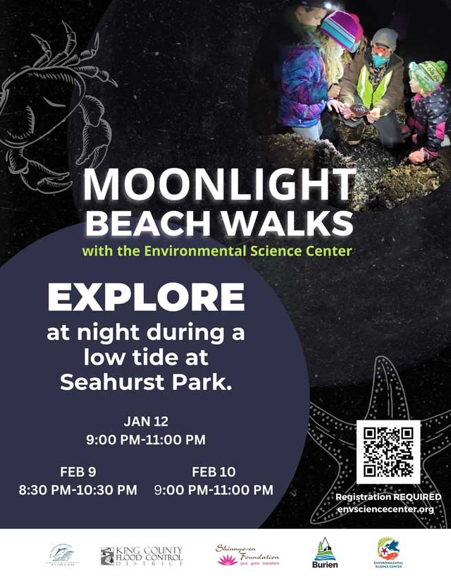 Burien’s Environmental Science Center will be holding Moonlight Beach Walks at Seahurst Park over the next two months, allowing you to see marine organisms in a whole new light – your flashlight!