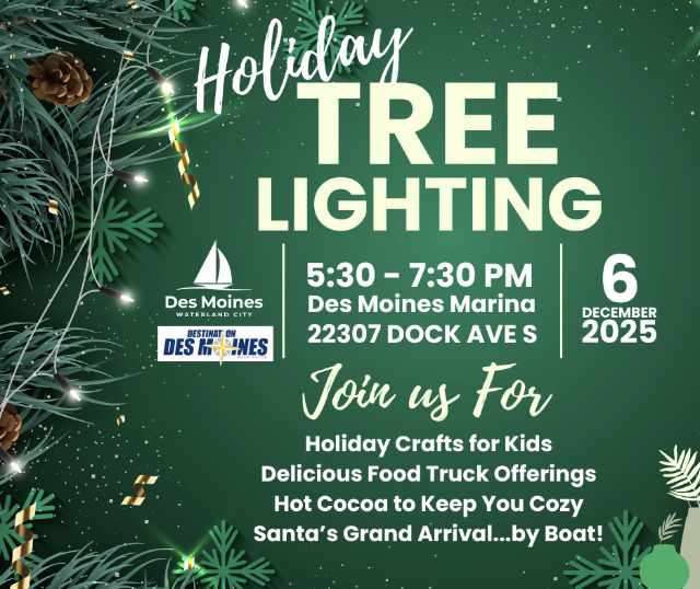 The City of Des Moines will host its annual Holiday Tree Lighting celebration on Saturday, Dec. 6, 2025, from 5:30 to 7:30 p.m., with this year’s festivities moving to a new location at the Des Moines Marina.