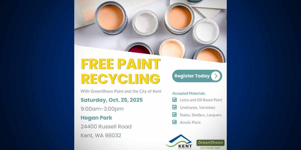 GreenSheen Eco-Friendly Paint, in partnership with the City of Kent, will host a free paint recycling event on Saturday, Oct. 25, from 9 a.m. to 3 p.m. at Hogan Park (map below).
