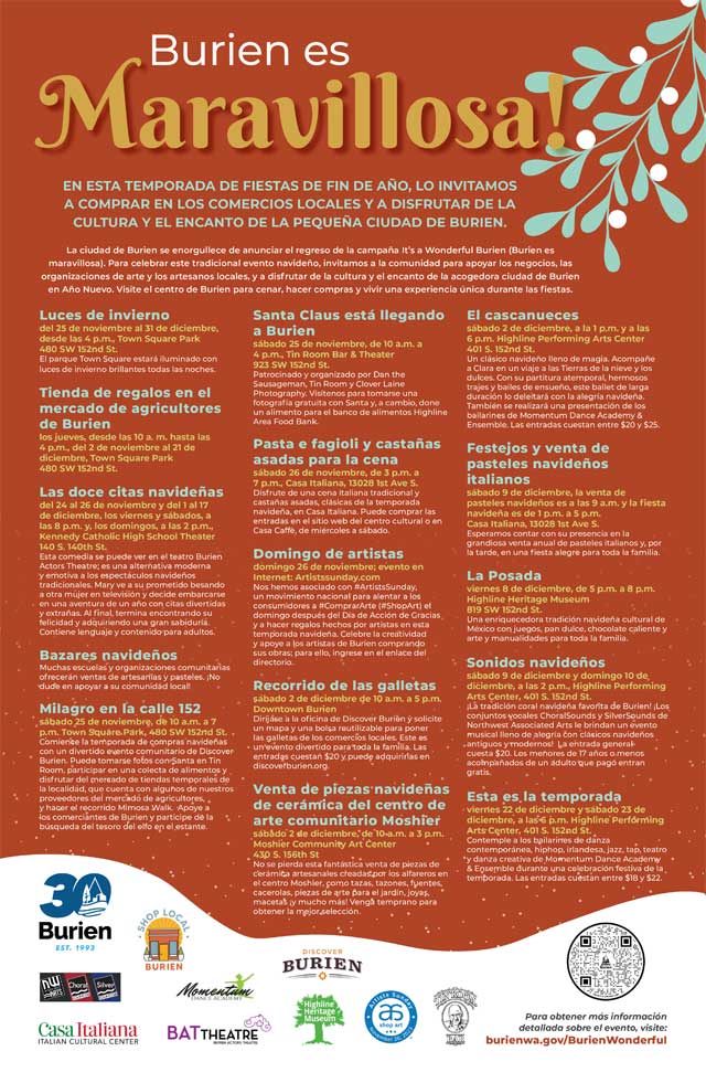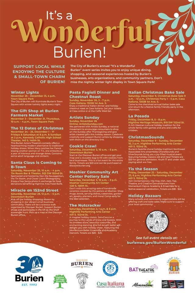 “We believe Burien is a special place to create holiday memories with your friends and family,” Bailon added. “Enjoy our local events and winter traditions while supporting the groups and businesses that make Burien unique.”