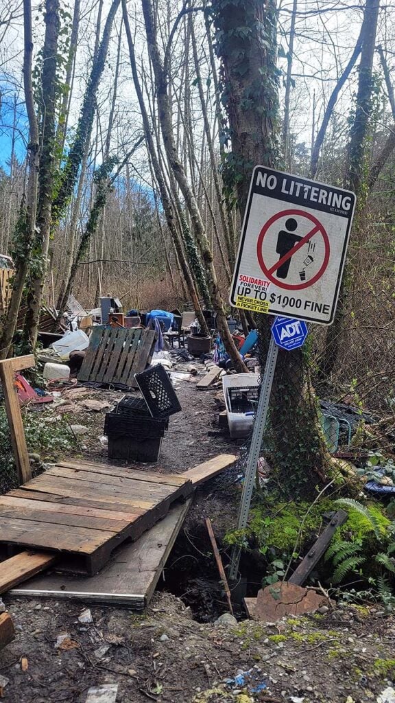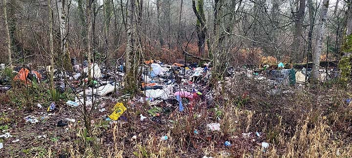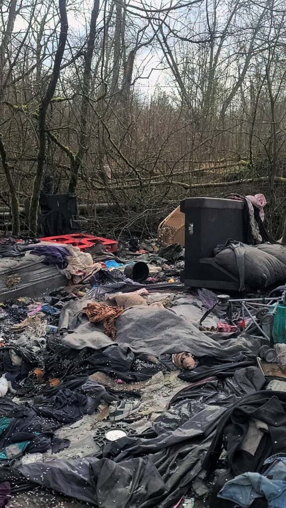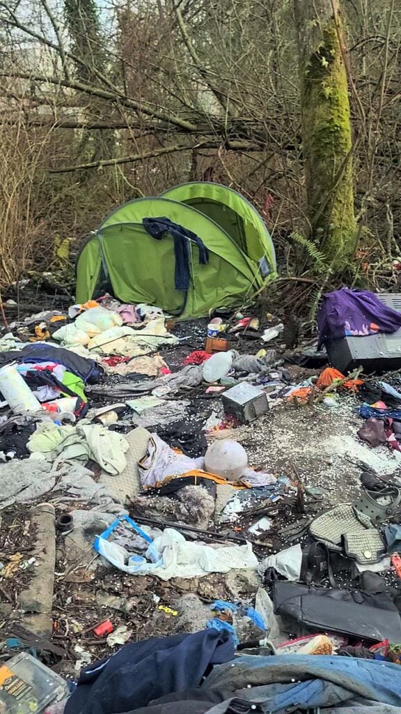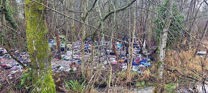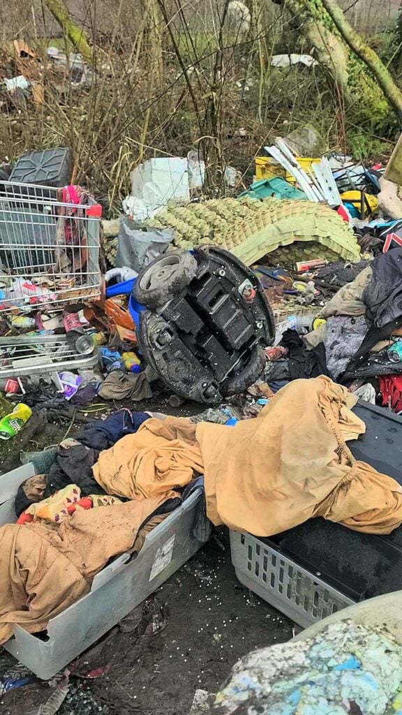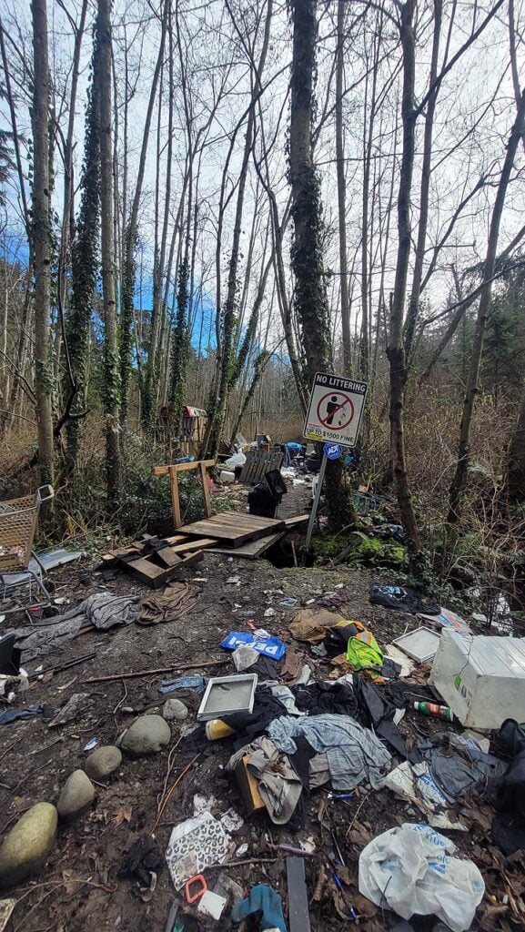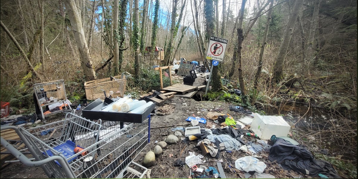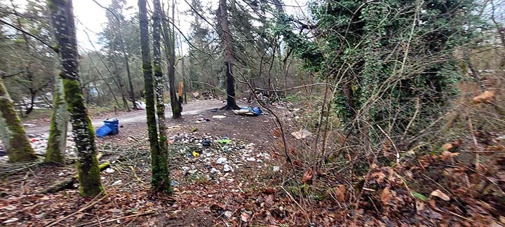 According to Hitchcock’s observations, the site contains scattered debris including shopping carts, strollers, copper wire and other trash. He said efforts to limit access, such as placing barriers to prevent carts from entering the area, have not stopped dumping, noting that carts and debris remain visible throughout the wetland.