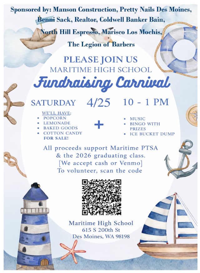 The carnival will be held at Maritime High School, 615 S 200th Street (map below), and will raise money for the Maritime PTSA and the Class of 2026.