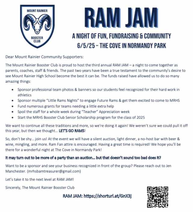 The Mount Rainier High School Booster Club is inviting the community to rally together for its third annual ‘Ram Jam’ on Thursday night, June 5, 2025, with a spirited night of fun, fundraising, and school pride at The Cove in Normandy Park.