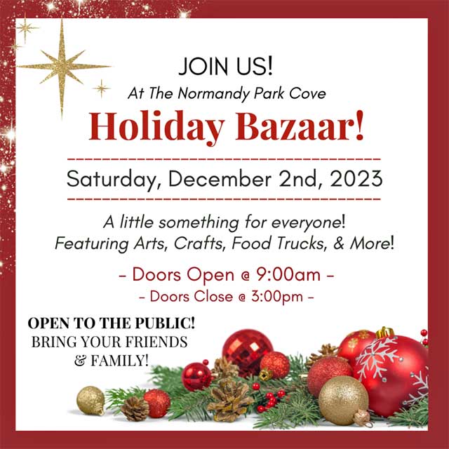 The Normandy Park Community Club Bazaar is a cherished holiday tradition that will return to The Cove on Saturday, Dec. 2, 2023 from 9 a.m. – 3 p.m.