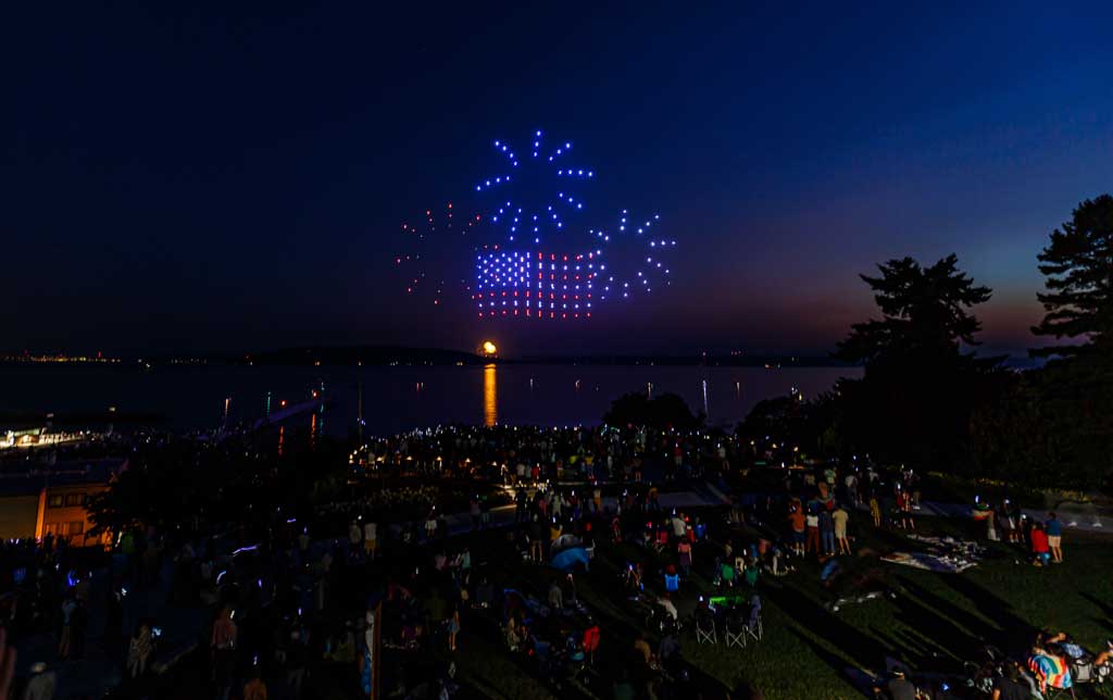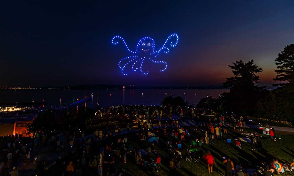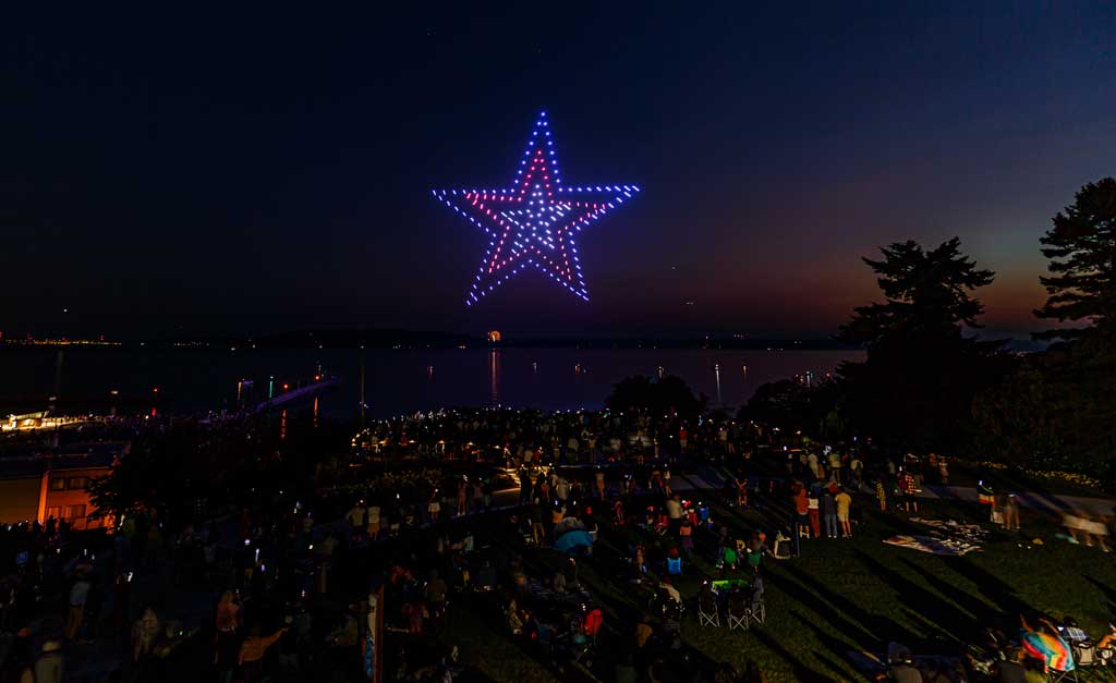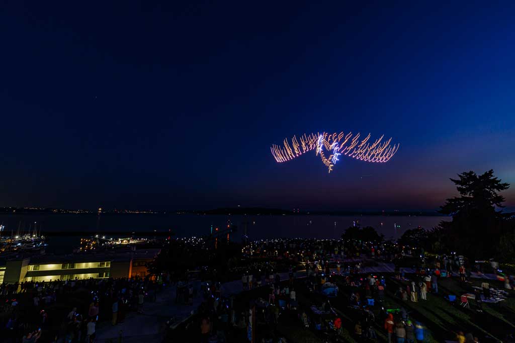 This was the first such exhibition over Des Moines, put on with 175 or so drones that made spectacular displays via computer programming – all without explosions, pollution or chemicals raining down into Puget Sound.