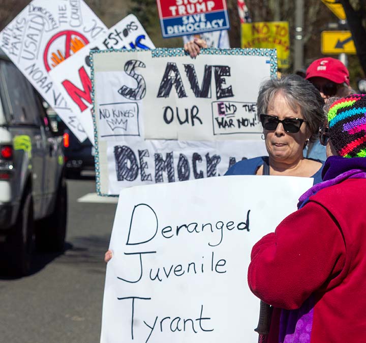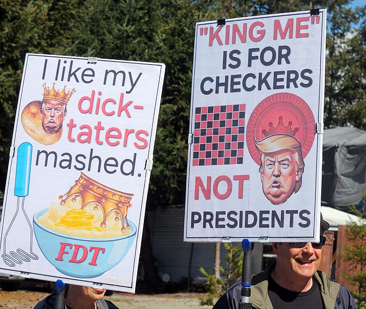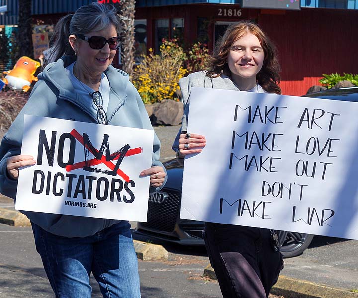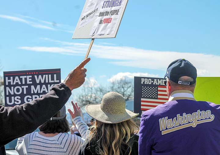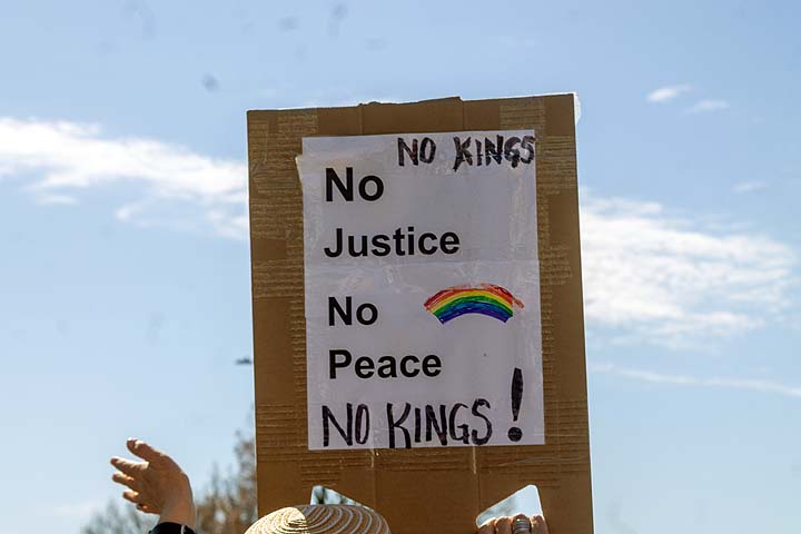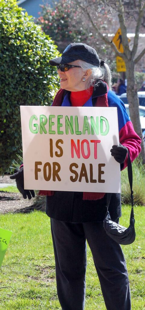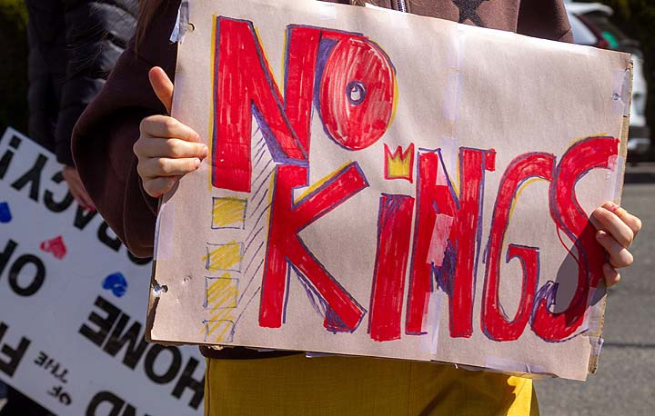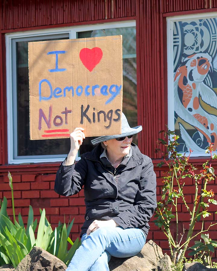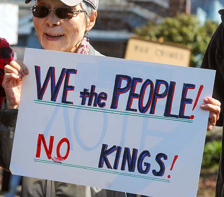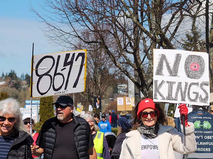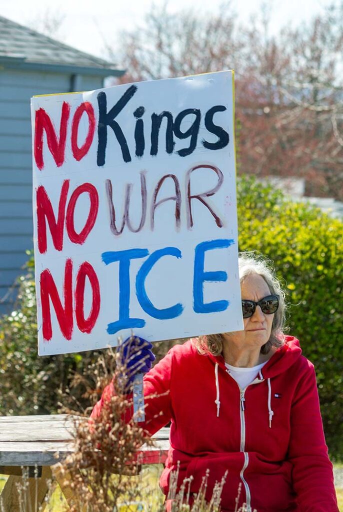 “I’ve been to all the No Kings rallies, including one in Poulsbo when we were visiting. Just like this one: friendly people. I want fairness for everybody. I don’t understand arresting people just because of the color of their skin. He’s looting the Treasury, stealing, stealing, stealing!”