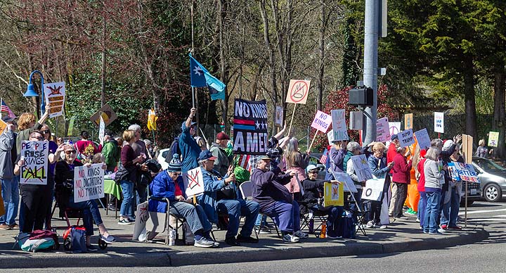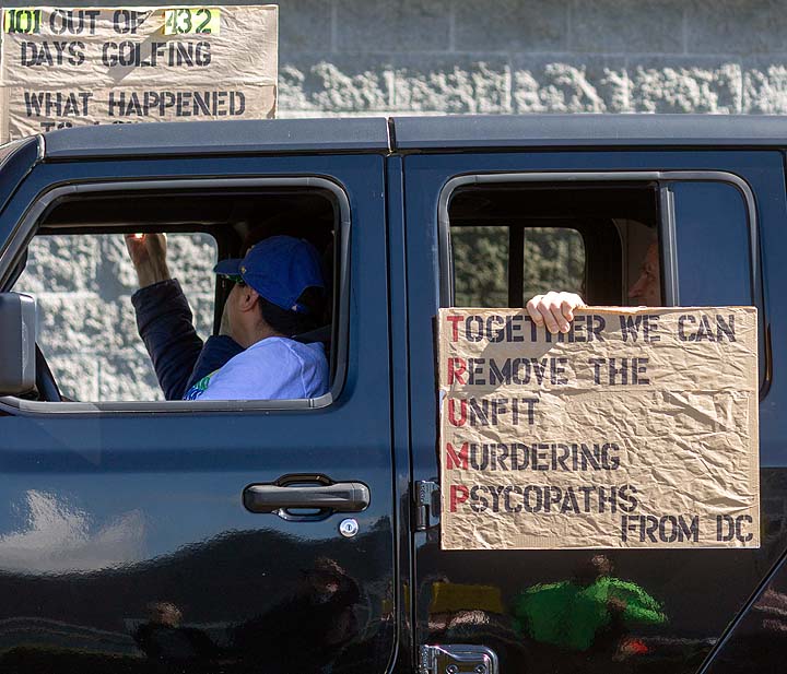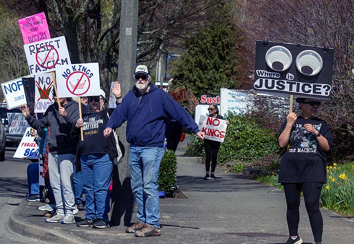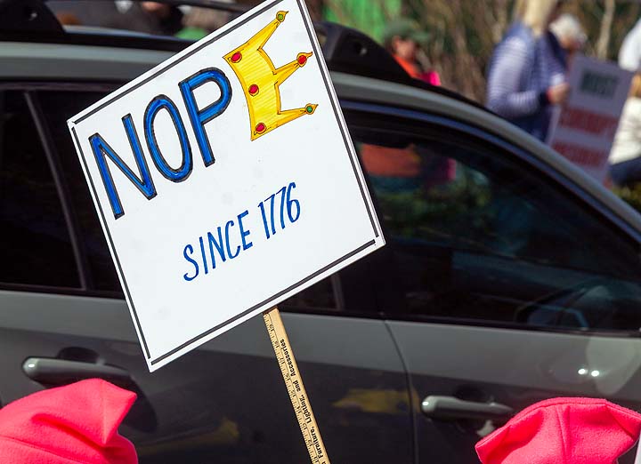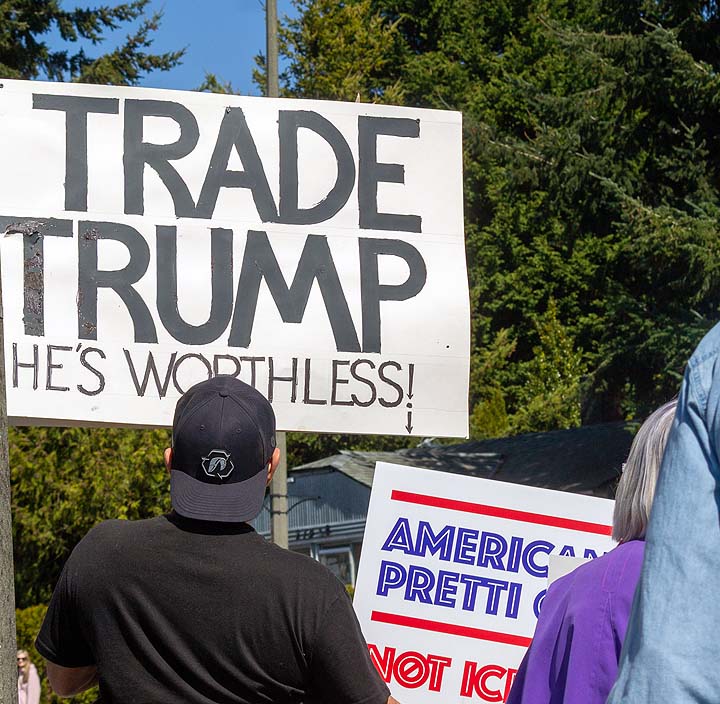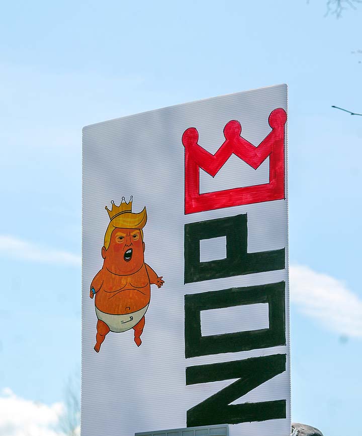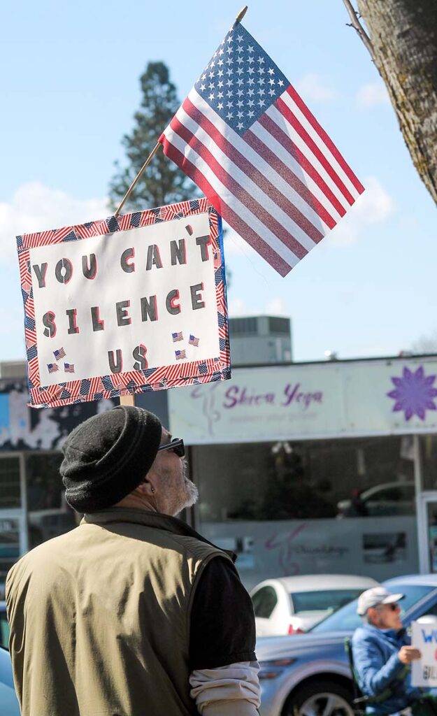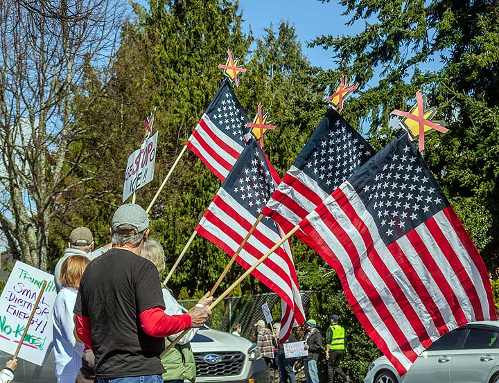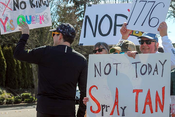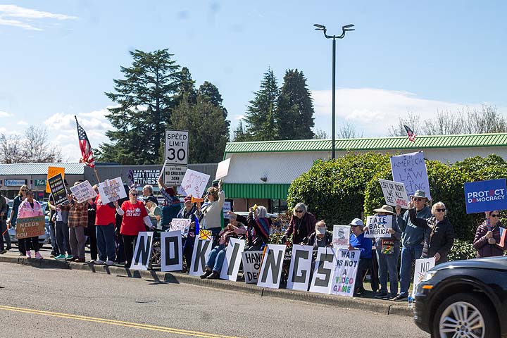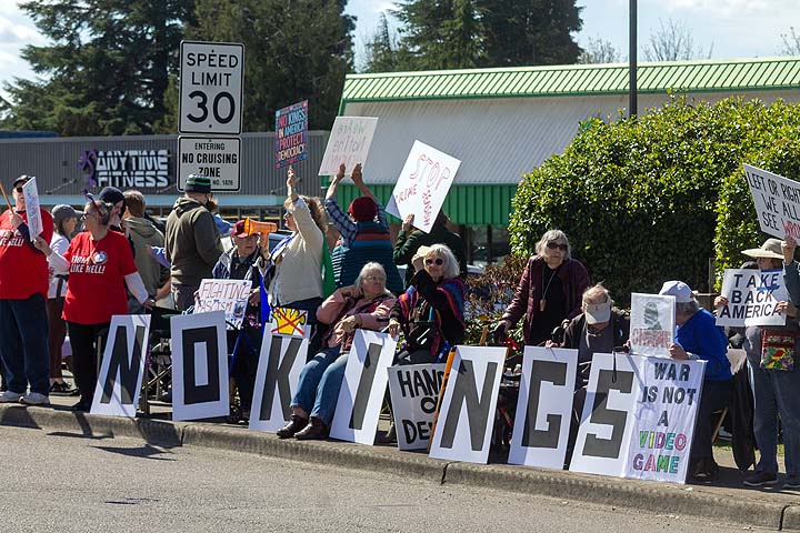 “I’ve been to all the No Kings rallies, including one in Poulsbo when we were visiting. Just like this one: friendly people. I want fairness for everybody. I don’t understand arresting people just because of the color of their skin. He’s looting the Treasury, stealing, stealing, stealing!”