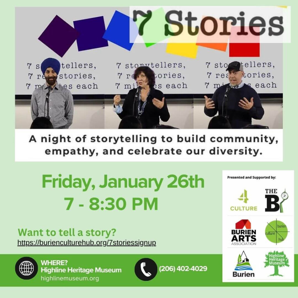 Please consider sharing your true story…in the spirit of community and friendship. We will coach/help you as much as you would like. To sign up, fill out the form online or email 7stories@burienculturehub.org.