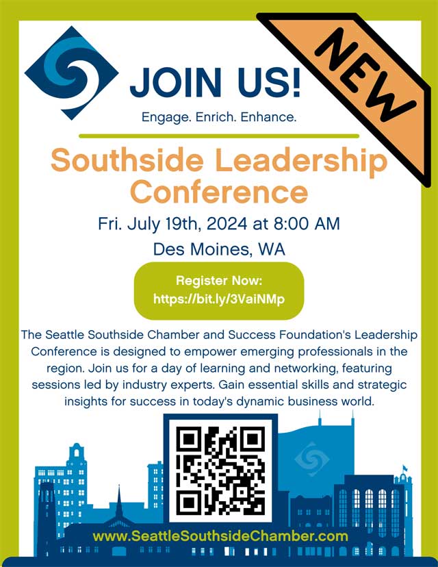 REMINDER: The Seattle Southside Chamber of Commerce’s Southside Leadership Conference will be held at Highline College this Friday, July 19, 2024, with eight workshops featuring incredible leaders in our community.