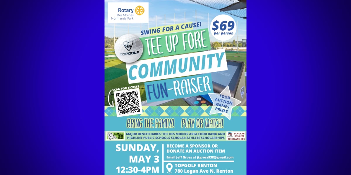 The event, titled “Topgolf Swing for a Cause,” will be held on Sunday, May 3, 2026, from 12:30 to 4 p.m. at Topgolf in Renton, according to local Rotarians.