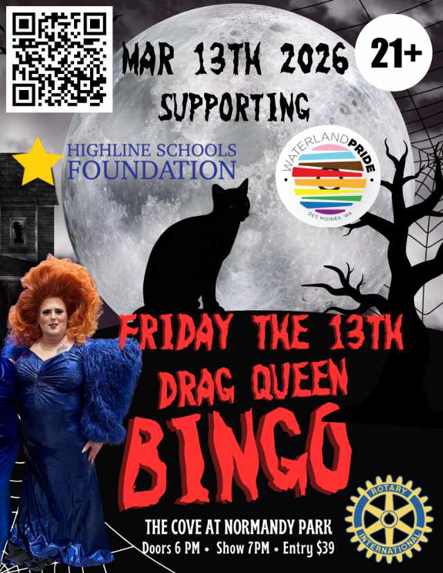The Rotary Club of Des Moines and Normandy Park will host a Spring Drag Queen Bingo fundraiser on Friday, Mar. 13, 2026, at The Cove in Normandy Park.