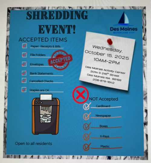The City of Des Moines will host a community shredding event on Wednesday, Oct. 15, 2025, from 10 a.m. to 2 p.m. at the Des Moines Activity Center (map below).