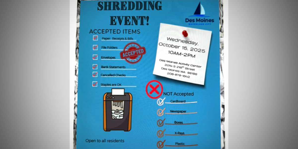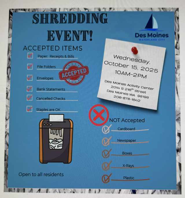 The City of Des Moines will host a community shredding event on Wednesday, Oct. 15, 2025, from 10 a.m. to 2 p.m. at the Des Moines Activity Center (map below).