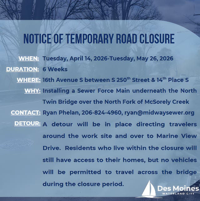 The closure will remain in place through Tuesday, May 26, and will affect 16th Ave South between South 250th Street and 14th Place South (map below).