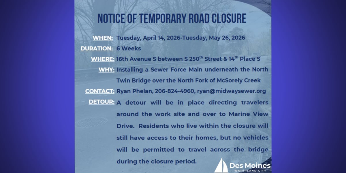 A six-week road closure is scheduled for a portion of 16th Ave South in Des Moines beginning Tuesday, April 14, 2026, according to the City of Des Moines.