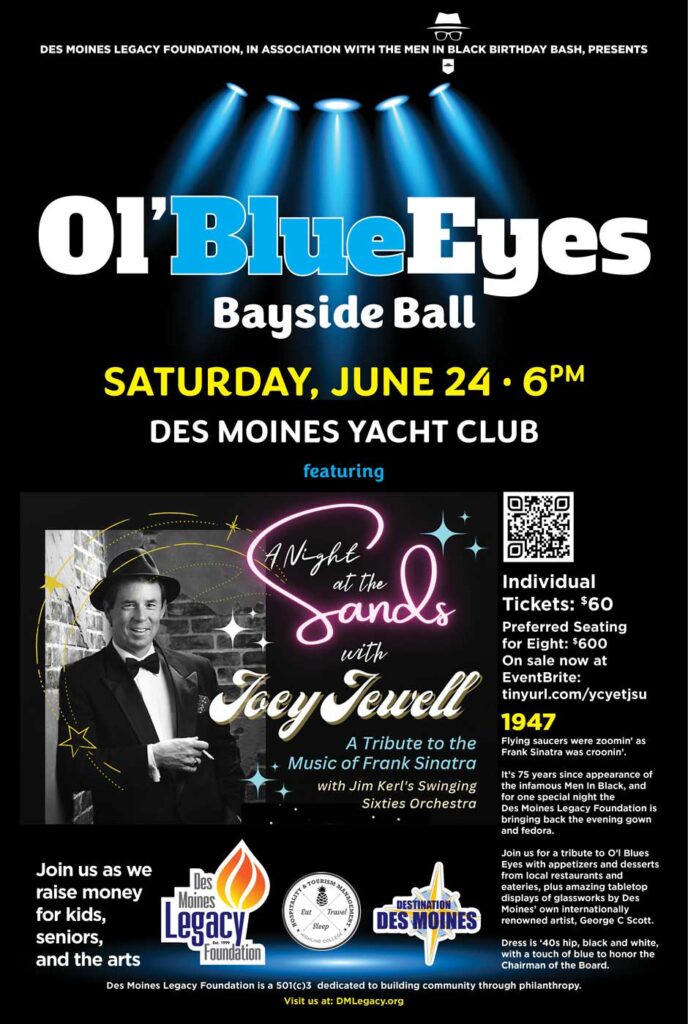The Des Moines Legacy Foundation will present the “Ol’ Blue Eyes Bayside Ball” featuring “A Night at the Sands, with Joey Jewell” at the Des Moines Yacht Club on Saturday night, June 24, 2023, starting at 6 p.m.