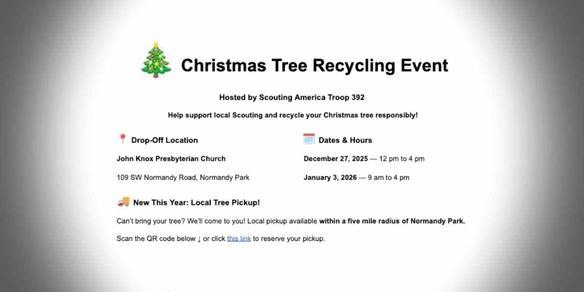Scouting America Troop #392 will host a Christmas tree recycling fundraiser in Normandy Park with drop off dates in late December and early January, according to an event flyer. The […]