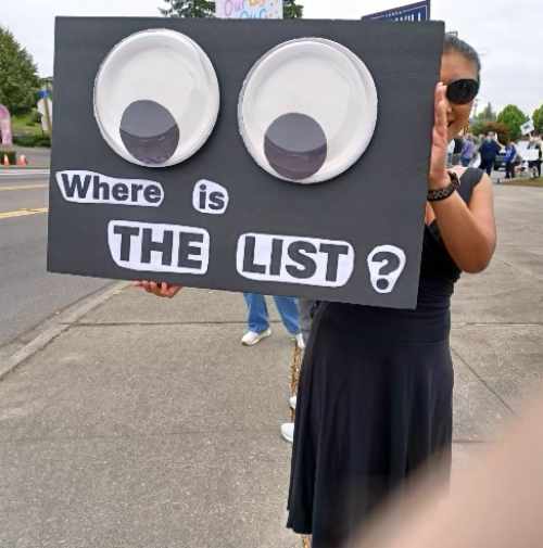 “I live in Federal Way and I’ve been to many protests, including down in Olympia, and the participation in this one is very good. I started going 4-5 months ago. Question: Why are you doing it? Answer: You have to prioritize: this is our obligation to stand up and speak for what is morally right and wrong. When I was a teacher, that’s what I taught my kids- to live by that.”