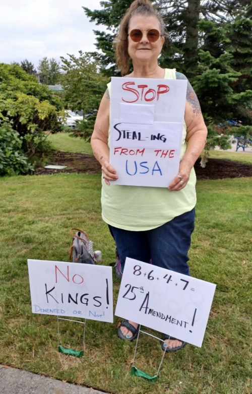 “I’m from Tukwila. My friend from SeaTac recruited me and our friend from Normandy Park. My first protest in my life was the No Kings Day rally. Because we’re older, we can see what’s going on. Young people just aren’t tuned into it because they’ve always taken things for granted.”